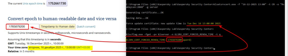 klscflag.exe -fget -pv klserver -n KLSRV_CERT_FORCED_RENEW_TIME -t q