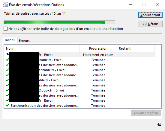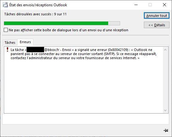 4. Je viens de lancer un : nslookup smtp.bbox.fr sur le Powershell, ma résolution DNS est bonne, je n'ai pas de "UnKnown" ou "DNS request timed out" mais bien "194.158.122.55". Je viens de tester la connectivité TCP, via : "Test-NetConnection smtp.bbox.fr -Port 587", j'ai toujours un "False" et le port 587 est toujours bloqué. :/ Lorsque je teste le SMTP de GMAIL, via : "Test-NetConnection smtp.gmail.com -Port 587", j'ai cette fois ci un "True" et ça fonctionne, le blocage n'est donc pas Local. Ok je regarde ça.