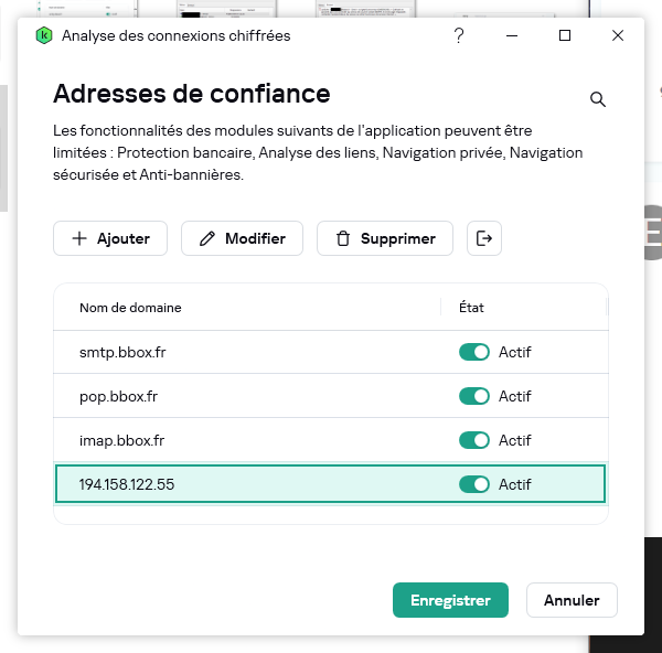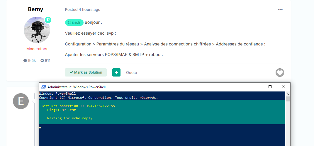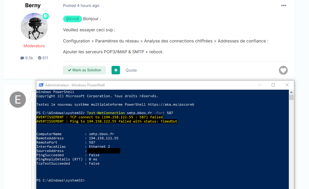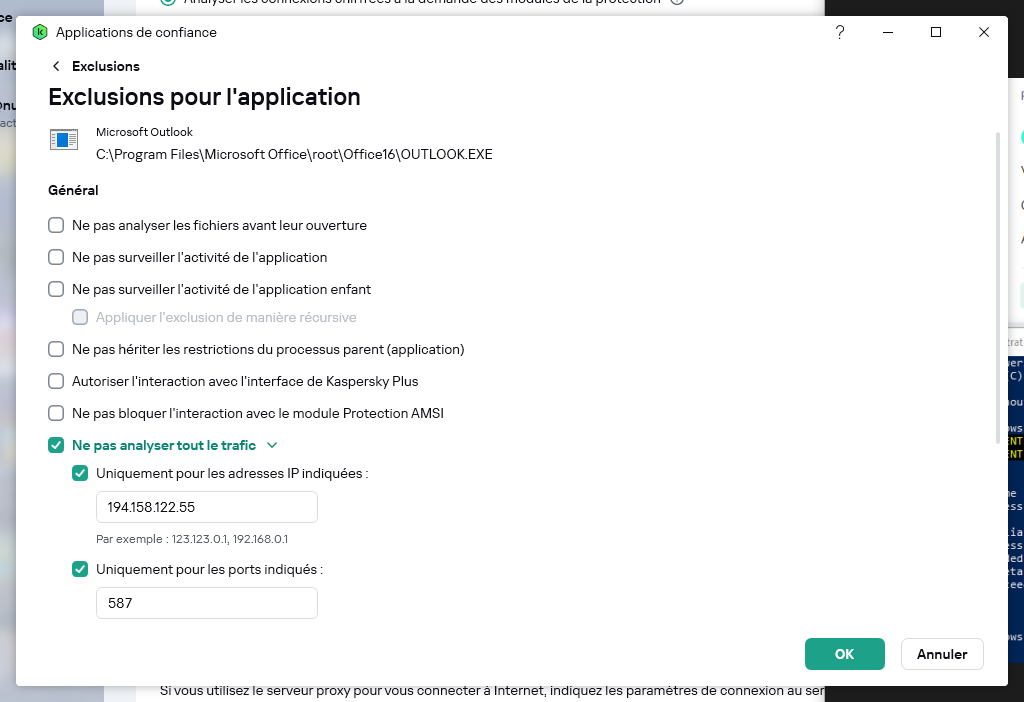 8. Je viens d'à nouveau renseigner le SMTP, POP et IMAP, j'ai également rajouté l'adresse IP du SMTP, j'ai rebooté, cette fois ci c'est bien resté enregistré. J'en ai également profité pour ajouter une Exclusion applicative sur Outlook. J'ai également coché la case : Ne pas analyser tout le trafic>Uniquement pour l'IP correspondant au serveur SMTP (194.158.122.55) et le port 587. Puis j'ai Confirmé et rebooté le PC. Tout est resté enregistré suite au reboot du PC. En revanche le problème persiste lorsque je tente de pinguer le serveur via le PowerShell ou que je tente d'envoyer un mail à partir de mes boites @BBOX.FR :(