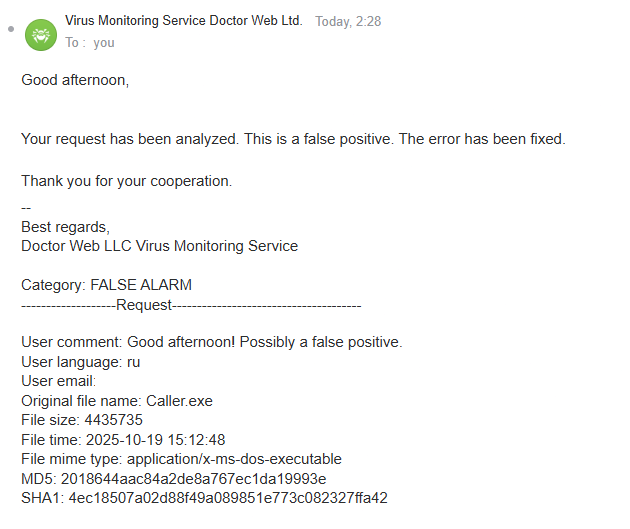 11. Their virlab replied that a false detection has been fixed (screenshot). But the file is still being detected by DW products - there is some kind of delay in detection disabling. It should be fixed soon. But already now you can exhale and sleep peacefully.