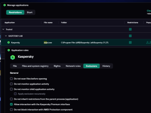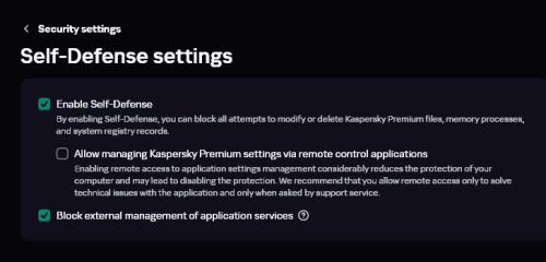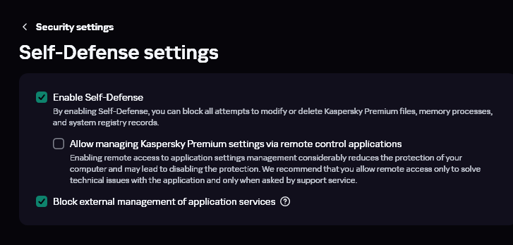 I've been using both RustDesk and Kaspersky Standard for several years. Recently, I needed to use the remote connection to interact with the Kaspersky interface to grant a local access permission (specifically, allowing access to a localhost). However, I found that I was unable to click on or interact with the Kaspersky application window via RustDesk. I ultimately had to resort to using a different remote connection software just to complete this task. I thoroughly checked the Kaspersky settings but couldn't find a way to change this behavior. My question is: Is it possible to configure Kaspersky to allow interaction with its interface while connected via RustDesk? -