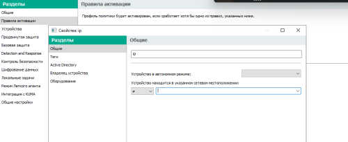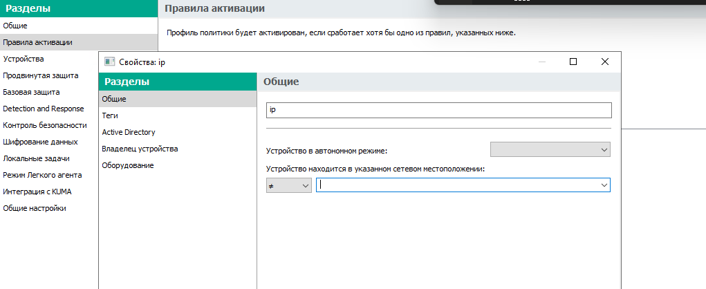 Добрый день, может кто сможет подсказать KSC 15.1 профили политик, правило активации политики. есть такой пункт как сетевое местоположение. Где его можно настроить что бы выбор был из выпадающего списка? или как тут указать два сетевых адреса разрешённых что бы в другом случае срабатывала политика к примеру