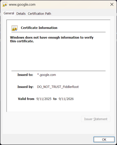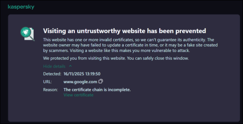 Operating System: Windows 11 Professional 24H2 (Build 26100.7171) Kaspersky: Kaspersky Standard 21.23.6.614 Installed Fiddler Classic on Windows PC to troubleshoot some issues on iOS mobile device (MDM, Exchange ActiveSync issues). I followed the official Fiddler documentation to capture traffic from iOS Device (https://www.telerik.com/fiddler/fiddler-classic/documentation/configure-fiddler/capturing-traffic/configureforios), including installing the Fiddler root certificate and configuring the iOS device to use the PC as proxy. I get the following error on the Windows PC browser when attempting to visit any website: "Visiting an untrustworthy website has been prevented" with the certificate "DO_NOT_TRUST_FiddlerRoot". Aside that, on the iOS device, after configure proxy, the Wi-Fi status shows "No Internet Connection". Previously, this was working before I installed Kaspersky Standard...short of disabling the entire Kaspersky protection while doing the troubleshooting, how do I apply the necessary exclusions for Fiddler Classic and the Fiddler root certificate + disable certain protection (instead of disabling everything) so Fiddler works? Thanks -