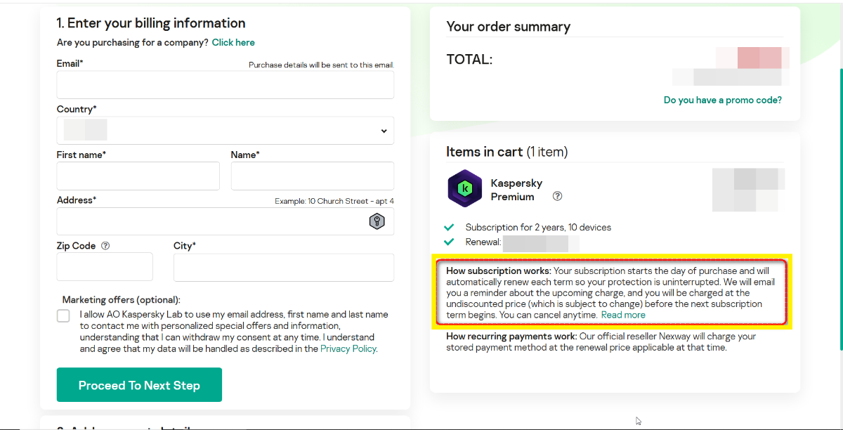 В общем, что-то тут намутили с акцией. Нигде не указывается, что подписка будет приобретаться для того аккаунта, из которого осуществлен переход по акционной ссылке (вернее, по ссылке из приложения, прикрепленного к аккаунту). Ни в самом рекламном окне (скрин выше), ни в корзине при оформлении (скрин ниже). Форма оформления абсолютно стандартная - указывается почта, куда высылаются подробности. Это явно неправильно. Даже если человек для себя приобретает, он может хотеть защитить другие устройства свои или родственников/друзей. Что тут будет дальше после покупки - тоже неизвестно: то ли новая лицензия отдельно будет в аккаунте, то ли продукты Free перейдут на нее... Одна сплошная непрозрачность. Раньше вроде такого не было, публиковались такие ссылки, не было подобных жалоб. Так он и был указан другой, там сразу ничего нельзя нажать, нужно все поля заполнять. -