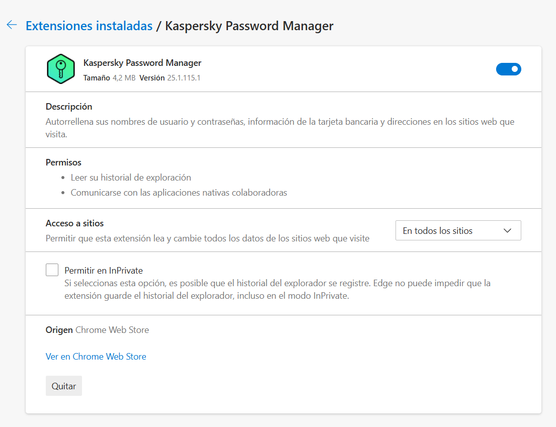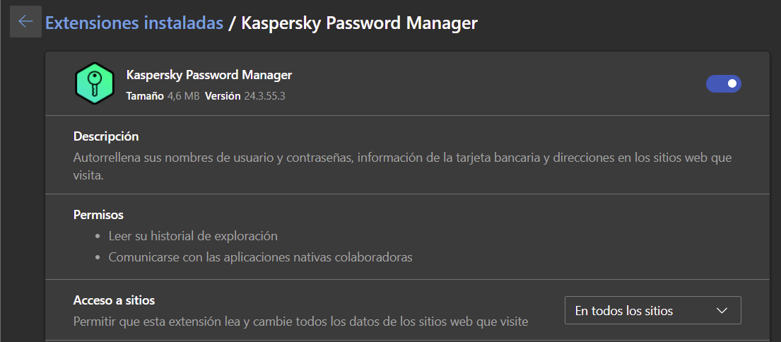 KPM -> Kaspersky PassWord Manager 🙂 Mi versión es más moderna, están en la sección anterior; Administrar Extensiones, pulsa en Actualizar: