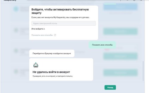 проблема была почта но я её утерял пытаюсь завести аккаунт на другой почте чтобы активировать Kaspersky Free но чтото идёт нетак.. аккаунт завёл но связи между аккаунтом и программой невозникает. в яндексе пишет: Перейдите обратно в приложение, чтобы завершить вход. Можете закрыть это окно. но в программе пишет не удалось войти в аккаунт. проверьте, есть ли интернет, и повторите попытку.. -