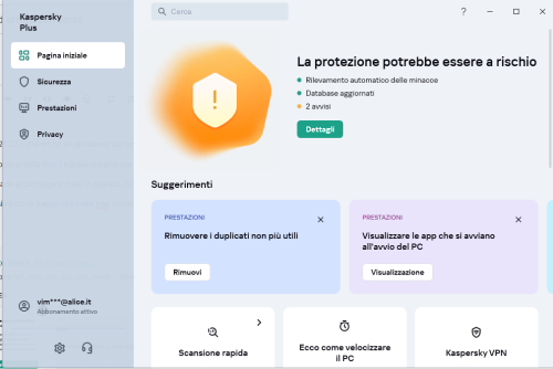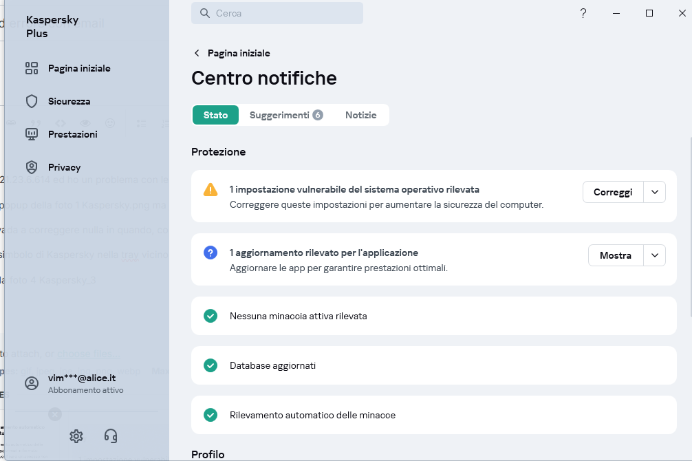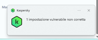Salve a tutti, Uso Kaspersky Plus 21.23.6.614 ed ho un problema con le emails di Microsoft Office LTSC Professional Plus 2021. Ogni tanto mi esce il popup della foto 1 Kaspersky.png ma cliccando su Correggi mi esce il popup della foto 2 Kaspersky_1.png ma sembra che non vada a correggere nulla in quando, come detto prima foto un po' il popup della prima foto si ripresenta. Inoltre cliccando sul simbolo di Kaspersky nella tray vicino all'orologio, mi esce come da foto 3 Kaspersky_2.png e cliccando su dettagli mi da come da foto 4 Kaspersky_3, Ed infine cliccando su Correggi del primo avviso mu su ripresenta il warning della foto 2 Kaspersky_1. Come faccio a riaolvere? Grazie anticipatamente Enzo