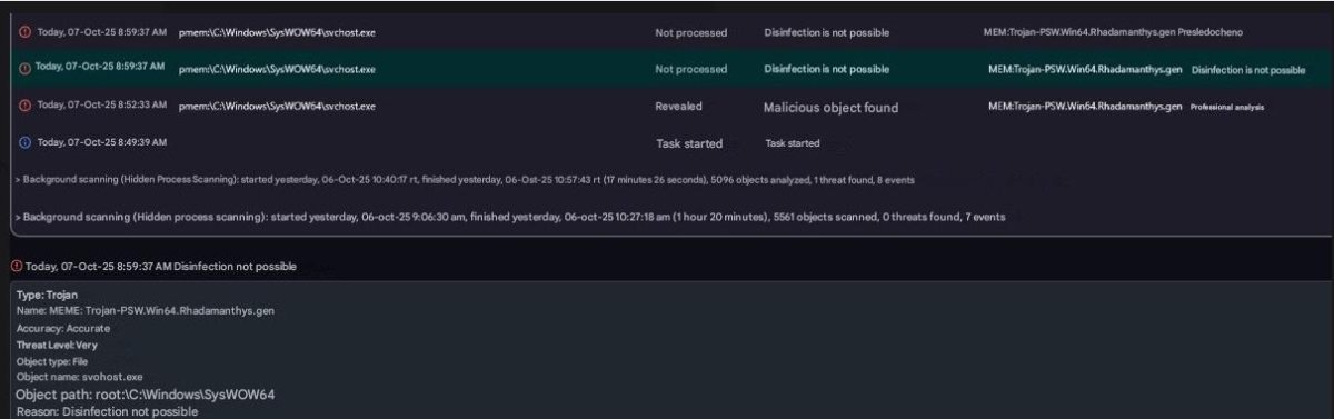 I have a problem with the Rhadamanthys PSW trojan. Kaspersky finds it in the path: pmem:\C:\Windows\SysWOW64.I also tried cleaning in Safe Mode and there is no change. I checked the detected "infected" svchost.exe file from the SysWOW64 directory online, and nothing unusual is reported. After cleaning without restarting, Kaspersky reports infection of e.g. Firefox tabs, Twitch... programs that are currently active. Ignoring and adding to exceptions does not work. To open the infected file from the antivirus I need a special program to read from pmem:.