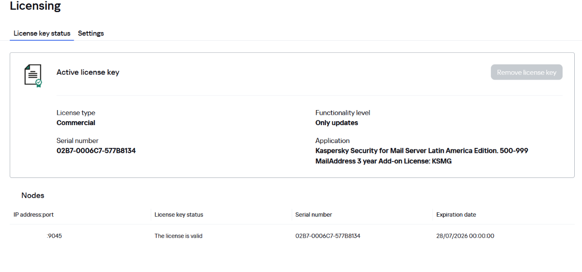 I'm migrating from KLMS to KSMG. I've installed two KSMG 2.11 virtual appliances in a test scenario, (aren't connected yet to our corporate LAN nor Internet) and added the license key (valid untill July 2026) in one of them. The license is recognize as commercial and valid, but the functional level exhibed in the status is "Only for updates" and all protection's modules (AV, AS, AP,etc)are restricted and its configurations disabled. We tried license in the other one with the same result. What's wrong?? Any help, please.