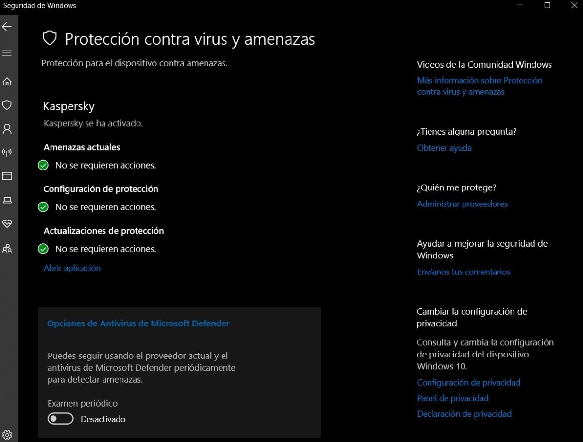 Windows siempre se esta actualizando, la unica vez en que se activaba el microsoft defender y hacia escaneos era cuan kaspersky estaba desactivado, por ejemplo al instalar una version nueva de kaspersky, por eso me parecio raro que estando activo kaspersky, microsoft defender detecto algo en un archivo y lo puso en cuarentena, como si kaspersky no estuviera activo, pero si lo estaba 🤔 y ese mismo archivo, escaneado con kaspersky no arrojo ninguna infeccion de ningun tipo. Quizas solo por un pequeño momento se desactivo kaspersky y entro el microsoft defender, lo cual es raro igual, en ese momento no estaba haciendo ninguna tarea demandante, asi que no hay razon para que kaspersky dejara de responder por ejemplo y se active el microsot defender porque windows detectaba que no habia antivirus activo. Por ahora todo normal, veremos si pasa de nuevo en algun momento. -