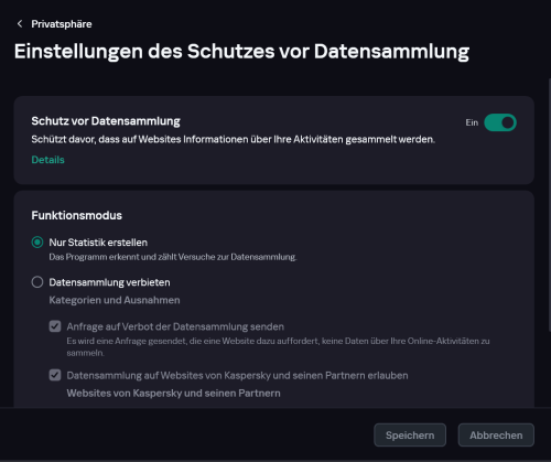 @Longlife @Schulte Ich habe eben die MR24 durch direktes "Drüberinstallieren" installiert. Bisher alles einwandfrei. Das Problem mit der Browser Erweiterung für Edge besteht immer noch im Admin-Konto. Laut Kaspersky kann man sie aktivieren und kommt dann auf den Link zum Registrieren in Edge, aber der Status in Kaspersky selbst dazu ändert sich nicht. Ich habe die Erweiterung auch mal aus Edge deinstalliert und neu verknüpft, aber weiterhin dasselbe Problem. Aber die Erweiterung ist in Edge aktiv und zeigt mir auch bei Google-Sucheinträgen das Kaspersky-Logo mit der Einstufung der Webseiten an. Und das Status-Anzeige-Problem besteht auch weiterhin nur im Admin-Konto, im Standardkonto passt alles. Vermutlich nur ein kosmetischer Fehler, der weiterhin ignoriert werden kann, richtig? Allerdings habe ich zu etwas anderem noch eine Frage: Beim Überfliegen der Einstellungen bin ich bei dem Hinweis zum "Schutz vor Datensammlung" etwas verwirrt. Das Ganze hat den Status "ein", aber zeigt auch den Hinweis "Aktivieren Sie in den Einstellungen das Verbot der Datensammlung". Ist der Schutz nun aktiv oder muss / kann ich zusätzlich noch etwas aktivieren? (siehe Screenshot). Ich habe auch mal in die Einstellungen geschaut, welche ist da zu empfehlen? Und wie war diese im Vergleich bei der MR23? Danke im Voraus für die Hilfe. - Today