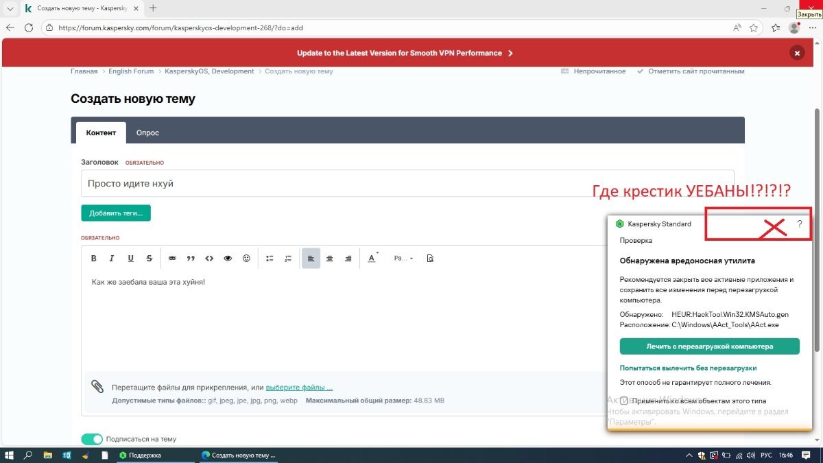 Как же заебала ваша эта хуйня! Я Русский, не собираюсь платить ха пендосскую ОС!!! Вопрос!: нахуя меня ваша хуйня, меня зебывает сообщением, как буд то активатор это вирус, ну хуй с ним, молодец, что то нашел, МОЛОДЕЦ! Но я знаю что это хуйня, и хочу с этим активаромом жить, добавляю его в исключение, но ваш КАВ, то есть уебанский антивирус, за который Я ЗАПЛАТИЛ, даже не дает возможности его просто закрыть, это что за хуйня????????????????????????????????????????? РЕШИТЕ! ИЛИ ВЕРНИТЕ ЧТО УПЛОЧЕНО! PS: Лучше блять Панду использовать!!! ФУ ФУ ФУ ФУ!!!!!!!!!!!!!!!!!!!!!!!!!!!!!!!!!!!!!!!!!!!!!!!!!!!!!!!!!!!!!!!!!!!!!!!!!!!!!!!!!!!!!!!!!!!!!!!!!!!!!!!!!!!!!!!!!!!!!!!!!!!!!!!!!!!!!!!!!!! Суки дабовьте крестик и ВСЕ!!!! Я даже не могу добавить BMP (Штатный скриншот) изображение к отзыву... ПОЗОР ЕБАНЫЙ! Куда мне это говно теперь деть??????????