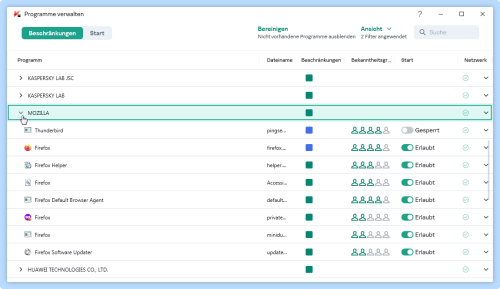 Hallo @LeuchtBall, willkommen. Kannst Du bitte schildern, welchem Programm Du wie den Internetzugriff gesperrt hast? In Deinem Screenshot scheint es mir nicht das Corel-Hauptprogramm zu sein, sondern ein Hilfsprogramm (Corel Update Helper x32). Kannst Du bitte über das Hauptfenster links "Sicherheit" auswählen, dann rechts etwas nach unten scrollen und "Programmüberwachung->Programme verwalten" anklicken? Im Idealfall haben die Corelkomponenten eine eigene Gruppe, wie in untenstehendem Beispiel Firefox in "Mozilla". Kannst Du dort den "Corel Update Helper x32" finden? Wie sind seine Einstellungen (Doppelklick auf das Programm)? Screenshot? -