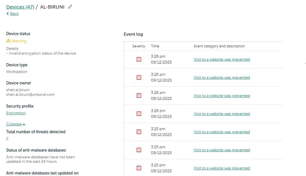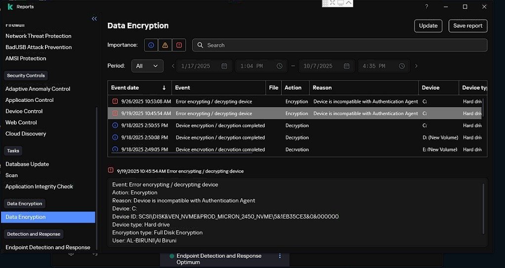 Dear Kaspersky Community, We are facing warning status regarding invalid encryption status, in many devices in Kes Cloud Console, and we don't understand the root cause of the issue, all these warnings are coming from the laptop PC. We checked one of the workstations and received the following status: "Device incompatible with authentication agent" (screenshot attached with event status). Is anyone else dealing with this situation? Regards Ahnaf Tahmeed -