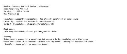 4. Hello, I’m experiencing an application crash on Android 13 related to coroutine execution. Under memory pressure, the app throws an OutOfMemoryError. The stack trace suggests that a coroutine job is being completed after it has already finished, while additional threads are still being requested from Dispatchers.IO (limitedParallelism). This results in a thread creation failure and the application crashes without user interaction. Environment: App: Kaspersky Android App version: 11.129.4.14969 OS: Android 13 Device: Samsung mid-range Android device Impact: Stability issue only. No data loss or security impact observed. Has anyone encountered a similar coroutine / memory-related crash on Android 13?