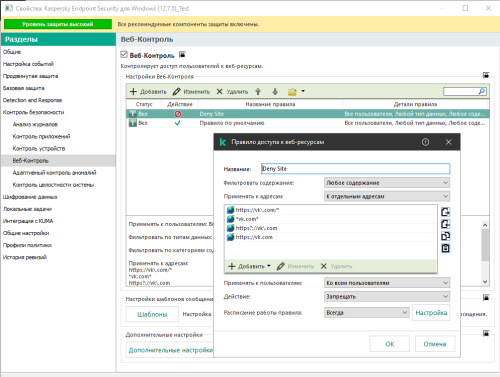 Не очень понятно чем ещё дополнить. Версии ОС, браузеров, ksc и kes указал выше. В настройках политики выставлены след. значения: -