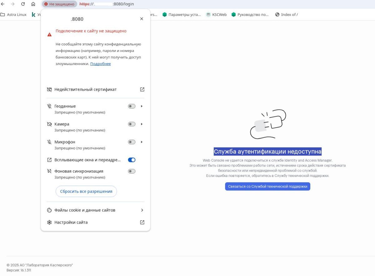 2. Добрый день. Подскажите в чем может быть проблема. После обновления KSC 15.3 AstraLinux 1.7.6 на KSC 16.1 (WebConsole 16.1.311) не подключается WebConsole. Служба аутентификации недоступна.