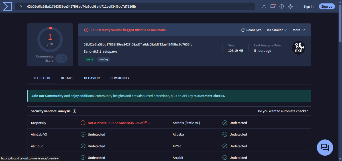 Здравствуйте. Собирался скачать определённый софт. Проверил через Virus Total файл exe и торрент файл высветил что нет угрозы, но именно .exe файл смутил только касперского. Ссылка на результаты Virus Total Но вот песочницы ничего не обнаружили и это тоже смотрел на вирус тотал (см скриншот) Сам касперский я раньше использовал, а сейчас использую через сервисы такие как Virus Total и Progress Explorer (официальная утилита от Microsoft) и поэтому я не смогу прикрепить следующие данные, так как это уже вопрос к сервису Virus Total. То что нужно указать перед публикацией темы: Операционную систему и ее версию - (см скриншоты) Название и номер версии программы "Лаборатории Касперского" - невозможно, так как я без понятия какую версию использует касперского Virus Total Подробно изложите суть вашей проблемы или вопроса - изложил выше При необходимости приложите скриншот проблемы - все скриншоты возможные прикрепил -