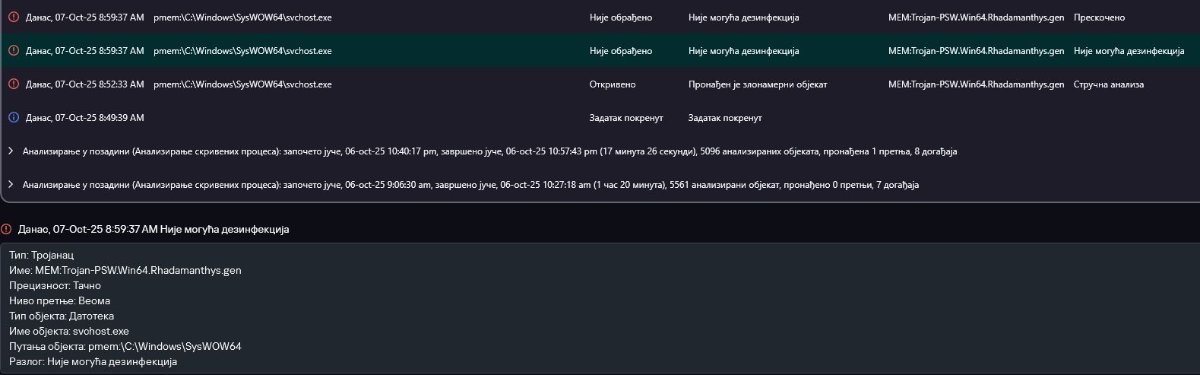 I have a problem with the Rhadamanthys PSW trojan. Kaspersky finds it in the path: pmem:\C:\Windows\SysWOW64.I also tried cleaning in Safe Mode and there is no change. I checked the detected "infected" svchost.exe file from the SysWOW64 directory online, and nothing unusual is reported. After cleaning without restarting, Kaspersky reports infection of e.g. Firefox tabs, Twitch... programs that are currently active. Ignoring and adding to exceptions does not work. To open the infected file from the antivirus I need a special program to read from pmem:.