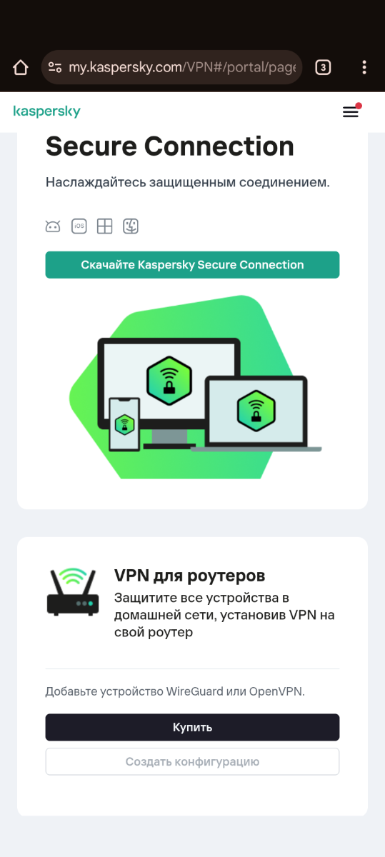 Вот захожу в неё ни никакого "VPN для роутеров" там нет. Только "Скачать Kaspersky Secure Connection" и кнопка с аналогичным названием. Нажимаю на кнопку - предлагается скачать для Windows или выбрать другие загрузки. В "других загрузках" только выбор магазина приложений для мобильных устройств (аппсторе и др) и куар-код для камеры. И всё, больше там нет ничего. Что делать? - Today