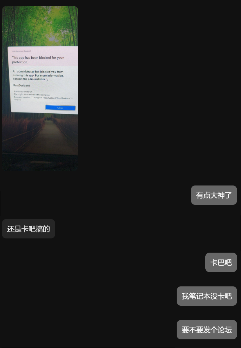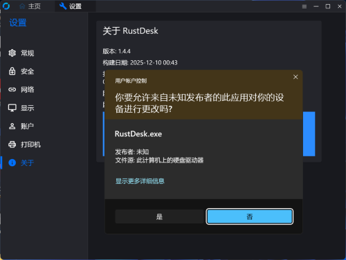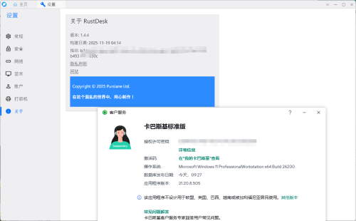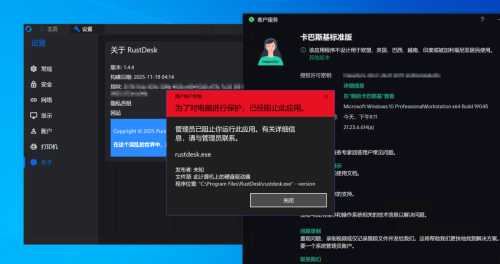 不清楚这个条件是否是由卡巴斯基造成的 但 同卡巴斯基的用户也就是我的朋友也出现该问题了 并且 在其他电脑上正常请求提权 且github issue 并没大面积反馈 图一是 在装有卡巴的电脑上运行时 图二是 在win11的笔记本 无卡巴的环境 图三,图四是 我朋友以及他的卡巴环境和rustdesk版本 复刻条件: 当rustdesk请求提权时 会弹出这个问题 杀毒软件仅此卡巴斯基