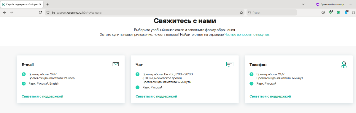 Поделюсь ссылками с увеличенными пробными периодами: Kaspersky Premium 60 дней. Kaspersky Premium 45 дней. Сравнение планов подписки: для Windows - https://support.kaspersky.com/help/Kaspersky/Win21.23/ru-RU/152975.htm для MacOS - https://support.kaspersky.com/help/Kaspersky/Mac26/ru-RU/223916.htm для Android - https://support.kaspersky.com/help/Kaspersky/Android_11.126/ru-RU/141191.htm для iOS - https://support.kaspersky.com/help/Kaspersky/iOS_2.101/ru-RU/213284.htm Там после перехода по ссылке сразу открываются контакты: https://support.kaspersky.ru/b2c/ru#contacts -