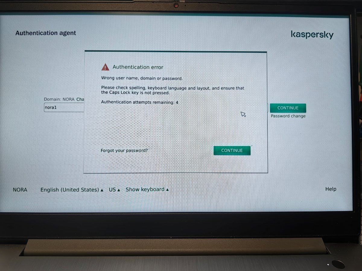 Здравствуйте. Несколько лет назад на работе выдали ноутбук. Пользовался им без проблем. Недели 3 назад потребовалось для работы установить программу SAP от Роснефти. Там надо было оформить заявку на перелёт сотрудника. Для её корректной работы надо было поставить Kaspersky endpoint security и включить полнодисковое шифрование, контроль usb устройств. Для этого так пришлось установить Kaspersky security center и создать политику в которой включены эти опции. Все получилось. Заявку оформили. Но после перезагрузки ноутбука. Не могу зайти на рабочий стол. Kaspersky Authentication Agent просит логин и пароль. При установке KES ни каких логинов и паролей не задавал. Почитал справку. Надо вводить логин и пароль учётки в windows. Но он их не принимает. Ошибки в логине и пароле 200% быть не может. Так как я их почти каждый день вводил приходя на работу. Помню их на зубок, да и сверил с записями в блокноте... Память не подводит. Подскажите почему не пропускает KAA. -