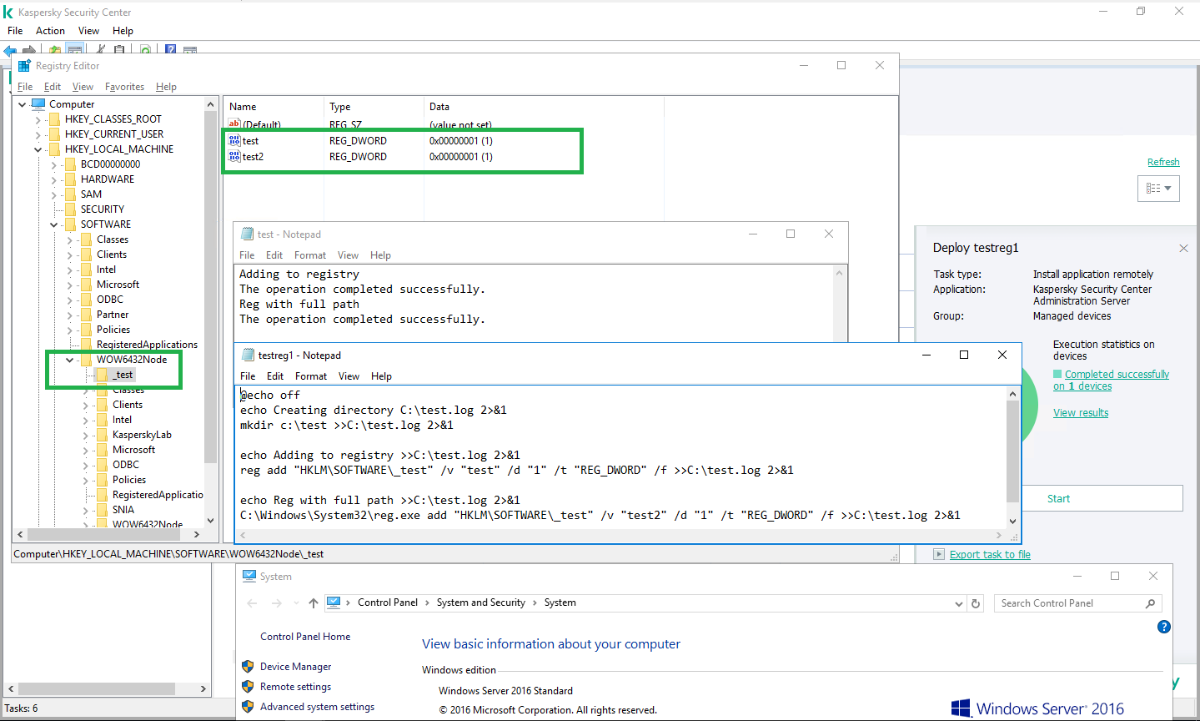 I have a few external clients that I cannot send updates via other means, so what I usually do is create an application (ie BAT) in KSC for them. And this works, without a doubt. A folder can be created for instance. But - and this is the weird part - registry changes are not being made!? Take this sample script for instance: ------------------------------------------------------------ @echo off echo Creating directory >C:\test.log 2>&1 mkdir c:\test >>C:\test.log 2>&1 echo Adding to registry >>C:\test.log 2>&1 reg add "HKLM\SOFTWARE\_test" /v "test" /d "1" /t "REG_DWORD" /f >>C:\test.log 2>&1 echo Reg with full path >>C:\test.log 2>&1 C:\Windows\System32\reg.exe add "HKLM\SOFTWARE\_test" /v "test2" /d "1" /t "REG_DWORD" /f >>C:\test.log 2>&1 ------------------------------------------------------------ -> LOG indicates every command has been successfull, but only the directory was created! Nothing in the registry! Creating directory Adding to registry Der Vorgang wurde erfolgreich beendet. Reg with full path Der Vorgang wurde erfolgreich beendet. ------------------------------------------------------------ Any idea what's going on here? URLs: https://support.kaspersky.com/de/ksc/15.1/install/10625#block4 https://forum.kaspersky.com/blogs/entry/43-how-to-run-bat-files-remotely-ksc-for-windows -