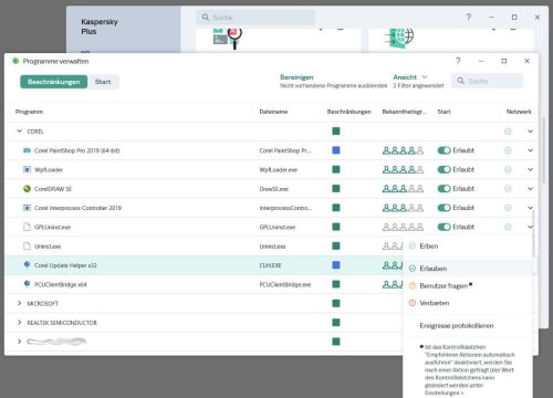Moin! Ich habe ein Problem mit Kaspersky Plus. Wenn ich den Netzwerkzugriff für ein Programm (in diesem Fall Corel) verbiete oder Benutzer fragen in den Regeln auswähle, passiert nichts, die Einstellung wird ignoriert und ich darf mir einigen Tage später wieder die Werbung anschauen. Was mache ich falsch? Hat da jemand einen Tipp für mich was ich machen kann ohne das Programm zu deinstallieren?