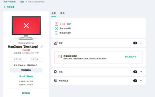从我今天购买卡巴斯基开始到现在大概过去1小时左右,突然就可以使用了。我分别做了如下操作: 1、卸载,重启,重新安装后根据无法登录账号 激活码激活显示传输层错误 改dns 也没用 - 家用产品支持 - Kaspersky Support Forum这篇文章逐条操作,无果。 2、再次卸载,重启,重新安装根据连接问题,进入软件显示无法连接到“我的卡巴斯基” - 家用产品支持 - Kaspersky Support Forum这篇文章操作,无果。 3、再次卸载,重启,重新安装根据安装卡巴斯基应用程序时出现“无法连接到‘我的卡巴斯基’”错误这篇文章操作,无果。 4、再次卸载,重启,重新安装在https://my.kaspersky.com/本页面下,如图一无订阅旁有一个发送激活(因为截图时我已经点击了,所以该图没有显示),我点击后再次重启,可以使用。