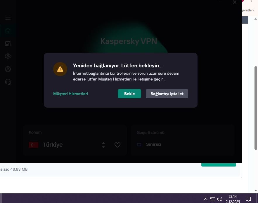 kaspersky vpnye bağlanmaya çalıştığımda "bağlanıyor.." kısmında kalıyor