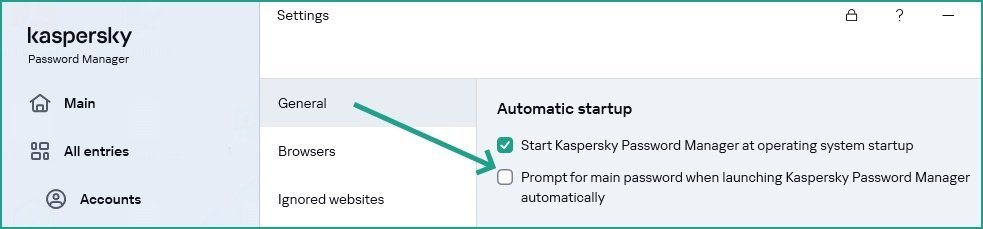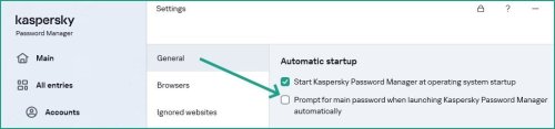 @Gunnish Bonjour, Veuillez consulter les options KPM dans → Section Général " Cette case active ou désactive la demande de saisie du mot de passe principal à chaque lancement automatique de Kaspersky Password Manager "