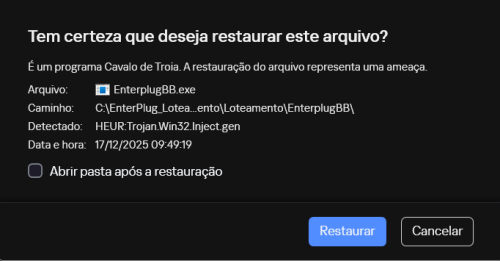 Utilizamos o Kaspersky em ambiente corporativo, instalado em todos os computadores da empresa. Em algumas máquinas usamos um sistema de terceiros chamado EnterPlug, mais especificamente o EnterplugBB. O problema é que, em determinados computadores, o Kaspersky está detectando e excluindo automaticamente dois executáveis desse sistema, identificando a ameaça como: HEUR:Trojan.Win32.Inject.gen Já realizamos as seguintes ações: Restauração dos arquivos pela quarentena Adição dos executáveis às Exclusões Configuração em Permitir aplicativo confiável Verificação das políticas aplicadas às máquinas Mesmo assim, o Kaspersky volta a excluir os arquivos logo em seguida, impedindo o funcionamento do sistema e causando impacto direto nas operações da empresa. Ressalto que: Os executáveis fazem parte de um sistema legítimo e utilizado diariamente O problema não ocorre em todas as máquinas, apenas em algumas A exclusão acontece automaticamente, sem possibilidade de manter os arquivos restaurados Dúvidas / Solicitação: Gostaríamos de saber: Como impedir definitivamente que o Kaspersky exclua esses executáveis Se há alguma configuração adicional de política ou heurística que precise ser ajustada Como proceder para análise e liberação (whitelist) desses arquivos por parte da Kaspersky, caso seja um falso positivo Se necessário, podemos enviar os executáveis para análise. Agradeço desde já o suporte.