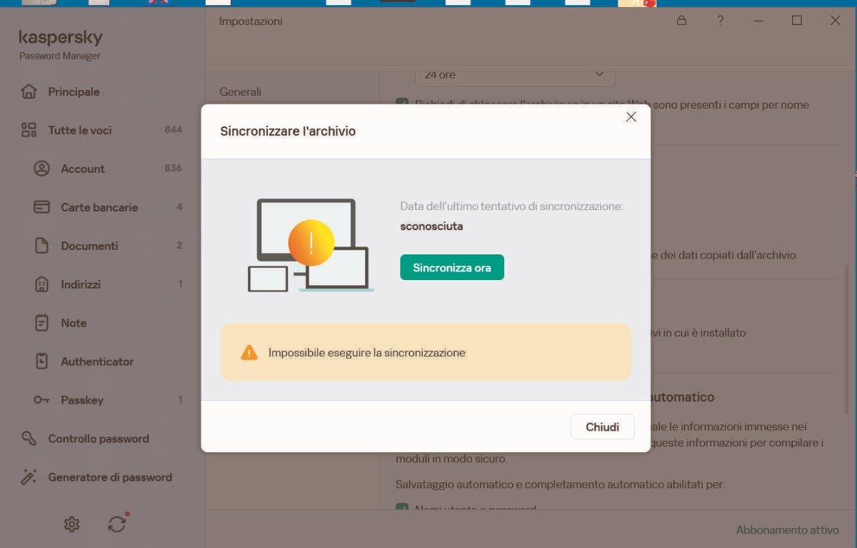 hello i have kpm included with kaspersky premium but I can't sincronize archives ("unable to synchronize"). i tried to disconnect account and reconnect but it won't work version 25.0.0.501 (a) / 1760810612_7731 / 1.1.0.2_1