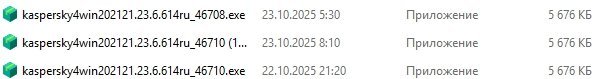 Обрисовал ситуацию и запросил через чат премиум поддержки офлайн версию. Ответили быстро-но прислали не офлайн версию а установщик. Вчера я устанапвливал kaspersky4win202121.23.6.614ru_46710.exe А техподдержка прислала kaspersky4win202121.23.6.614ru_46708.exe То есть прислали более старую версию ?-ведь 46710 больше 4608 Тем не менее присланная версия установилась нормально. Посмотрел "о приложении"-разницы со вчерашней нет -хотя вчера устанавливал более новую версию. Или я ошибаюсь и присланная новее? PS. Но вот что это было вчера? Непонятно. -