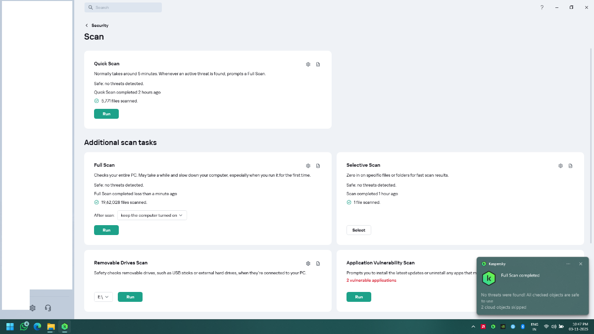 Full scan completed. Kaspersky didn't detect any threats. So I am at a completely confused how that Trojan.JS got there in the first place 😐 -