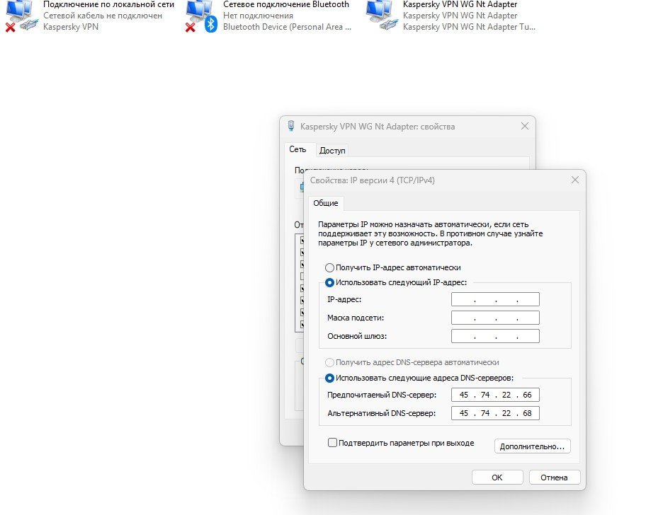 Kaspersky VPN есть в диспетчере устройств. В диспетчере не выставить dns. В списке подключений его нет. Как можно настроить DNS Kaspersky vpn? (win 11) 120 Продлялась автоматически осенью. Какая-то европейская была.