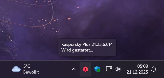 So, Neuinstallation hat nichts gebracht, Problem besteht weiterhin. Interessanterweise, fährt man mit der Maus auf das rote Symbol, steht dort nicht die aktuelle Versionsnummer von Kaspersky. Angezeigt wird Version 21.23.6.614, richtig wäre 21.23.6.614(a). Sobald das Symbol auf grün springt, wird die korrekte Versionsnummer angezeigt. -