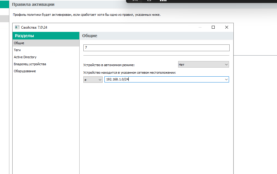 4. Добрый день, подскажите почему может не активироваться профиль политики, если правильно понимаю, когда сеть отличается от 1.0/24 должен блокироваться вэб доступ. но политика не активируется при смене