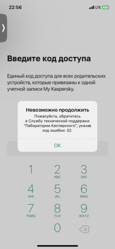При входе на родительском телефоне после ввода кода доступа пишет обратиться в тех. поддержку и сообщить код ошибки 32 -