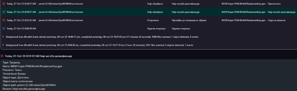 I have a problem with the Rhadamanthys PSW trojan. Kaspersky finds it in the path: pmem:\C:\Windows\SysWOW64.I also tried cleaning in Safe Mode and there is no change. I checked the detected "infected" svchost.exe file from the SysWOW64 directory online, and nothing unusual is reported. After cleaning without restarting, Kaspersky reports infection of e.g. Firefox tabs, Twitch... programs that are currently active. Ignoring and adding to exceptions does not work. To open the infected file from the antivirus I need a special program to read from pmem:.