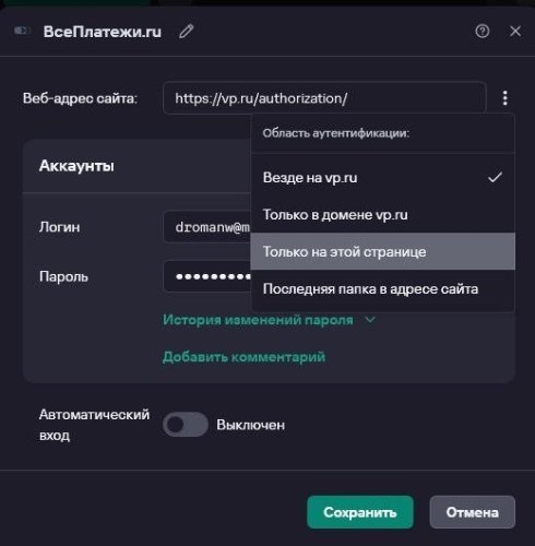 6. Здравствуйте. Очень бы хотелось, чтобы в исключениях сайтов появилась бы возможность добавлять адреса диапазонами. ну вот например, в локалке, мне нужно исключить запоминания паролей в сети 192.168.1.0/24 но я не могу так добавить значение. я должен добавлять каждый индивидуально. или домены и поддомены. Хотелось бы иметь возможность добавить в исключение не только сайт скажем www.domain.com а и все его поддомены, сделав дополнительную запись *.domain.com еще одно наблюдение - Менеджер паролей не очень различает адрес сайта сохраняемого пароля. Вот скажем domain.com/site1/ и domain.com/site2/ для KPM будет считаться одинаковым. и скажем разные логины\пароли для такой структуры - сохранить не удается. С поддоменами (site1.domain.com, site2.domain.com) такой проблемы нет