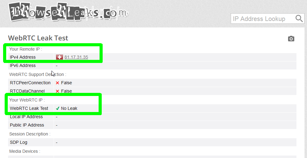 3. Hallo @khakan, kann sein, dass in Deinen Browsern die IP per WebRTC ausgelesen wird. Das ist vor allem dann möglich, wenn eine Webseite bzw. der Browser Zugriff auf Mikrofon oder Webcam hat. Kannst Du das bitte mal mit aktiviertem VPN auf der Seite https://browserleaks.com/webrtc prüfen? Im Idealfall sollte das Ergebnis so aussehen (meine VPN-Einstellung Schweiz):