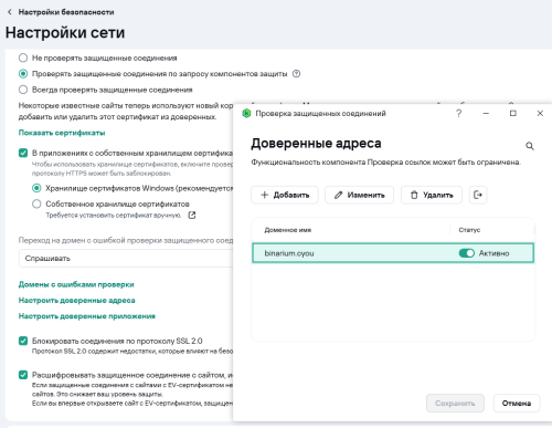 Или обновление пришло или перезагрузка помогла - сейчас хотя бы пишет что якобы подозрение на плохой сайт. Но так же не дает зайти дальше. Выключаю антивирус, обновляю страницу и всё работает. В исключения добавлять? Глянул события, изначально не подумал что антивирус, потому что домен прошлый тоже блокирован был, но это РКН старался. Там вот так: Имя приложения: chrome.exe Путь к приложению: C:\Program Files (x86)\Google\Chrome\Application Компонент: Интернет-защита Описание результата: Приостановлено Тип: Сайт, который включен в базу подозрительных веб-ресурсов Название: https: //ws. binarium.cyou/ connection/ websocket Степень угрозы: Средняя Тип объекта: Веб-страница Имя объекта: websocket Путь к объекту: https: //ws. binarium .cyou/ connection Причина: Базы -