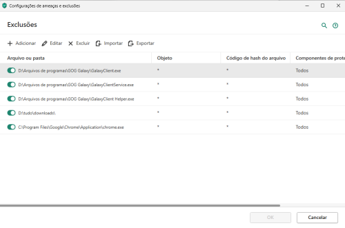 Dear community members! Since a few days ago, several different pieces of software have completely stopped being able to connect to the internet: Whatsapp for desktop, Discord for desktop, Teams for desktop, Microsoft Edge and Google Chrome. Everything else still works normally, to the point I can access Whatsapp, Discord and Teams through the Firefox browser. I couldn't get any specific error message other than ERR_CONNECTION_RESET. At first, I tried disabling both Kaspersky's and Windows' firewalls, and even disabling Kaspersky's antivirus didn't work either. Weirdly, today, I have tried again disabling Kaspersky and said pieces of software magically resumed being able to connect to the internet. Before that, I had tried several troubleshooting steps, without any success: (1) restarting the software; (2) clearing the browsers' caches; (3) installing the latest versions; (4) rebooting the computer; (5) restarting the internet connection; (6) connecting through wifi (I usually do so through cable); (7) resetting network settings as an administrator with Netsh winsock reset, Netsh int ip reset, Ipconfig /release, ipconfig /renew and Ipconfig /flushdns; (8) uninstalling all VPN software (I don't use VPN, but I'd read that some pieces of VPN software can still silently interfere with the internet connection). The several steps I took, coupled with the fact disabling Kaspersky now enables said pieces of software internet access, point to Kasperky Total Security as the culprit. I wouldn't be bothering you if this were a simple "add the blocked software to the trusted list", because all applications I mentioned are already in Kaspersky's trusted list, as shown in the attachments 1 to 5 (Tools => Manage applications => Application control). However, they can only work if I add them to another exclusion list, called "Exclusions", which be accessed by [Cog icon]=> Threats and exclusions => Manage exclusions (see attachments 6.1 and 6.2). I cannot overstate how weird this is: even though the pieces of software I mentioned are already in Kaspersky's own "trusted list", Kaspersky has started to suddenly and silently block them until I manually add them to another of Kaspersky's lists. I'm asking for help because as a layman, I'm afraid that adding the blocked pieces of softwares to that specific "Exclusions" list creates a security risk, and, to be honest, the need to manually add softwares alreadly listed as trusted to another list looks a lot like a bug. I'd like to definitely and safely address this bug or, at the very least, know how can I safely restart using Chrome, Teams, Discord, etc. My Kaspersky is in Portuguese, but I'm asking here in the English forum in order to broaden the support I can get. Kindest regards, Michel