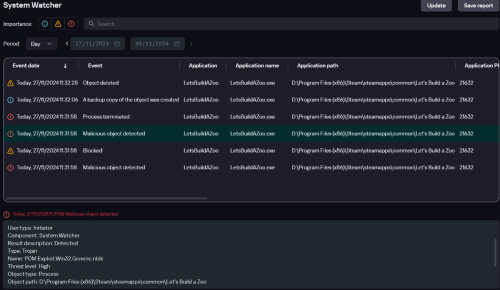The basic info requested: Windows 10, version 22H2 Kaspersky Premium, version 21.18.5.438(a) The game "Let's Build a Zoo" keeps being flagged as having a trojan under the name of PDM:Exploit.Win32.Generic and another under PDM:Exploit.Win32.Generic.nblk and Kaspersky shuts it down and deletes the file in question (the .exe of the game). This has rendered the game unplayable. Any time I try to run the game, Kaspersky closes it down with the following report. I have tried to reach out to both the publisher and developer, and they are adamant it is a false positive and that it is because it "was developed on an older software".