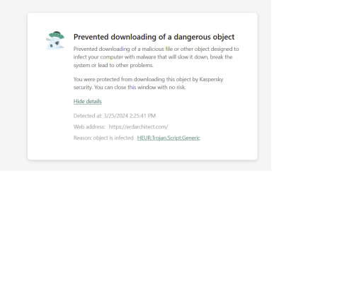 Hello, I am trying to connect to the ERD Architect Data Modeler website (it is "erdarchitect.com" and is an https site but for obvious reasons I am not putting the full URL here in this note) and Kaspersky keeps indicating that there is a dangerous object trying to download. This object is the Heur:Trojan.script.generic trojan. This occurs in both Firefox and Brave browsers which would be expected. I understand that it is possible the site is in fact infected but I would like to confirm. I recall reading on the Kaspersky site about providing the same information as above in another area of the site so it can be reviewed. Unfortunately, I cannot recall where this is to submit this. I have also included screenshots as well. Can someone direct me to this area so I can see if it is in fact an issue or a false positive? Thank you