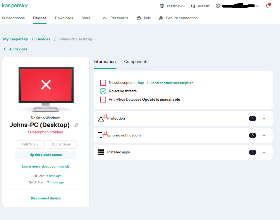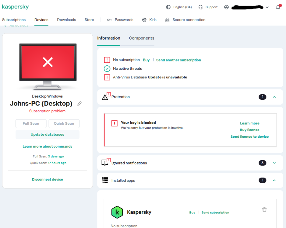 Subscription is blocked after updateJopa66 posted a topic in Kaspersky: Basic, Standard, Plus, Premium Just got back home today and noticed Kaspersky icon has turned red. From my previous thread I mentioned that Kaspersky Free v21.6.7.351 was updated to Kaspersky Plus v21.6.7.351 trial just yesterday. Everything was fine until sometime today in my absence. Attached screenshots should outline the problem. OS Windows 7 Sp-1