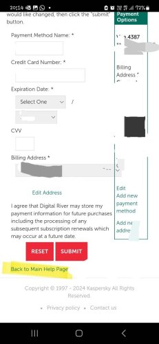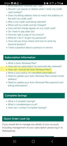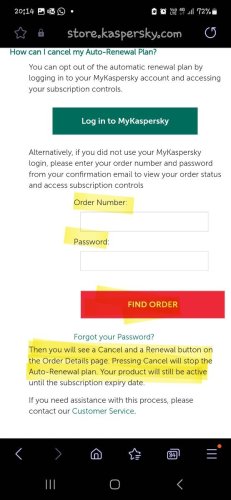 How to cancel auto renewal for Digital River (DRI) subscriptions - tested and worksRoseyEm posted a topic in Kaspersky Total Security After subscribing since 2018, and for the last couple of years just sucking up the auto-renewal, I was determined this year to put it to an end, and I have finally succeeded! I hope this information helps anyone else who is struggling to get rid of this payment. Please note this may only work if your payment is collected by Digital River... check your bank for last year's payment and if it is marked 'DR' or 'DRI' in the payment reference, this should hopefully work for you. When you get the renewal email reminder which provides an order number and password, click on the link for amending your payment details. You'll be taken to a page with your billing address and payment info. Underneath the 'reset' and 'Submit' buttons, there's a link for 'Back to main help page' - click it. This will take you to a FAQ page - select the cancel auto renewal heading. Now you'll be taken to another page where you need to re-input the Order Number and the Password from the email they sent. Once in there, click the cancel button (not manage subscriptions) and this will allow you to cancel the auto renewal. Seriously, the most ridiculous process ever, but it worked for me (after 2 years of unwanted renewals!). I've added screen shots to this in the hope I can help others who are struggling, and like me have ended up just letting the money go out each year. Good luck all.
