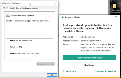 Hello, Since one week I get a lot of "invalid certificate" warning about well known websites; e.g., connect.facebook.net (see attached screenshot). I'm using Kasperski Free (currently 21.20.8.505) since a long time without issue in Windows 10 Pro FR (22h2 build 19045.5608). How could I solve this reccurrent issue?